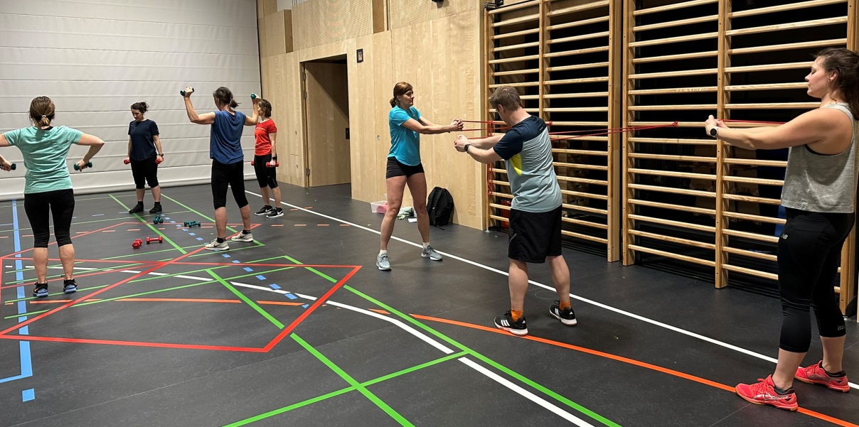 Wir setzen viele unserer Übungen mit dem eigenen Körpergewicht und Kleingeräten um (Kurzhanteln, Widerstandsbänder, instabile Unterlagen etc.), um so die inter- und intramuskuläre Koordination (Zusammenspiel innerhalb eines Muskels bzw. das Zusammenspiel von verschiedenen Muskeln) zu trainieren. |