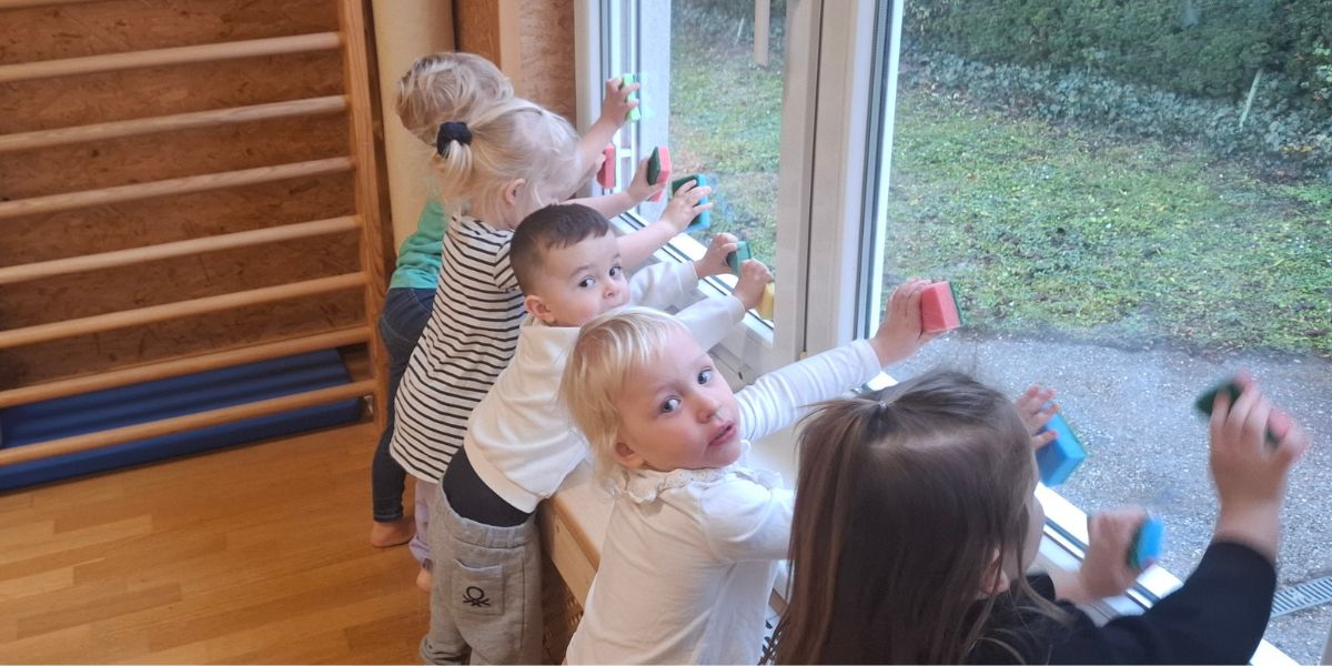 Damit zum Fest alles glänzt, stand anschließend der „Weihnachtsputz“ an. Ausgestattet mit zwei Putzschwämmen bewegten sich die Wichtel zum passenden Lied durch den Raum. Bei jedem Musikstopp wartete eine neue Aufgabe: So schrubbten die Wichtel eifrig die hohen Fensterglas Flächen, und die Bodenpflege bereitete besonders viel Spaß beim Gleiten auf den Schwämmen oder dem Fortbewegen auf allen Vieren. Auch die Türen wurden mit großen Bewegungen auf Hochglanz gebracht, wobei die Kinder spielerisch ihre Beweglichkeit trainierten.